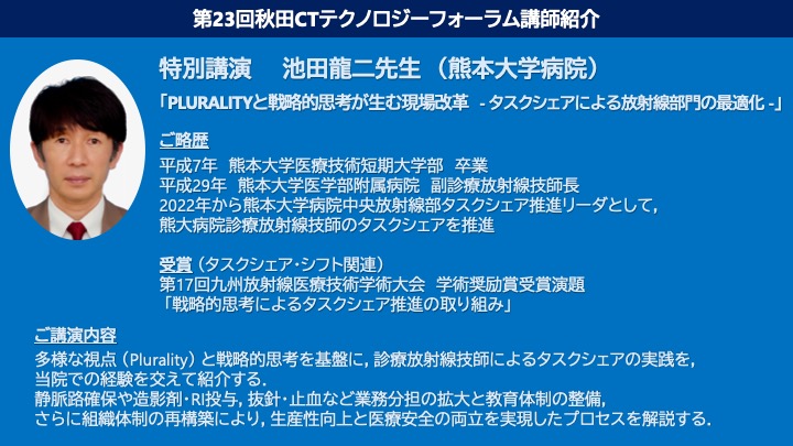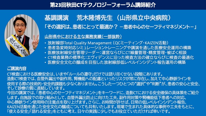基調講演は 山形県立中央病院 放射線部 荒木 隆博 先生、特別講演は 熊本大学病院 医療技術部 診療放射線技術部門 副診療放射線技師長 池田 龍二 先生 にご講演をお願いしております。