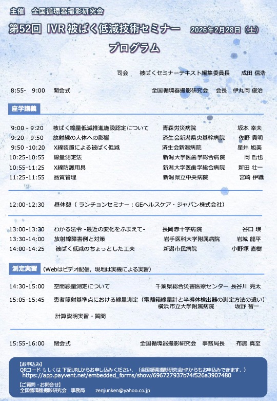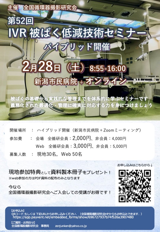2026年2月28日(土)に全国循環器撮影研究会主催「第52回IVR被ばく低減技術セミナー」を開催致します。セミナーでは被ばく低減に関する基礎知識や臨床時の実践的な被ばく低減技術、実用的な線量測定ビデオ+ライブ実習をハイブリッドにて開催いたします。