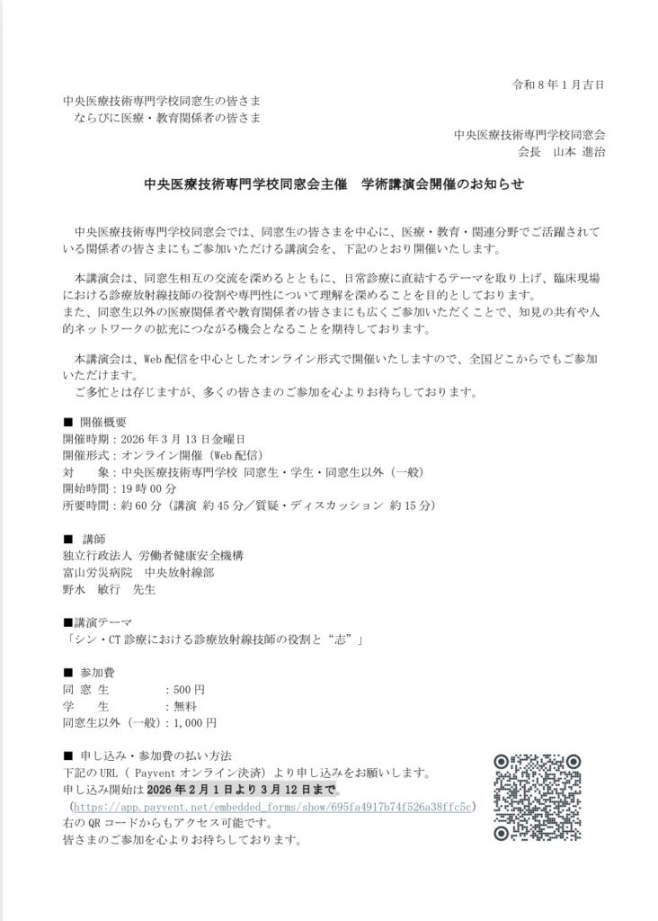 本講演会は、同窓生相互の交流を深めるとともに、日常診療に直結するテーマを取り上げ、臨床現場における診療放射線技師の役割や専門性について理解を深めることを目的としております。また、同窓生以外の医療関係者や教育関係者の皆さまにも広くご参加いただくことで、知見の共有や人的ネットワークの拡充につながる機会となることを期待しております。