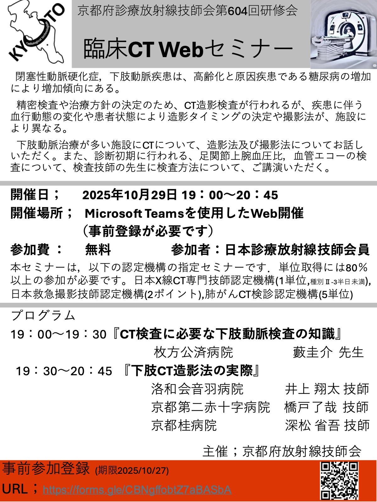 | 単位付与 | 日本X線CT専門技師認定機構:1単位 日本救急撮影技師認定機構:2単位 肺がんCT検診認定機構:5単位 |