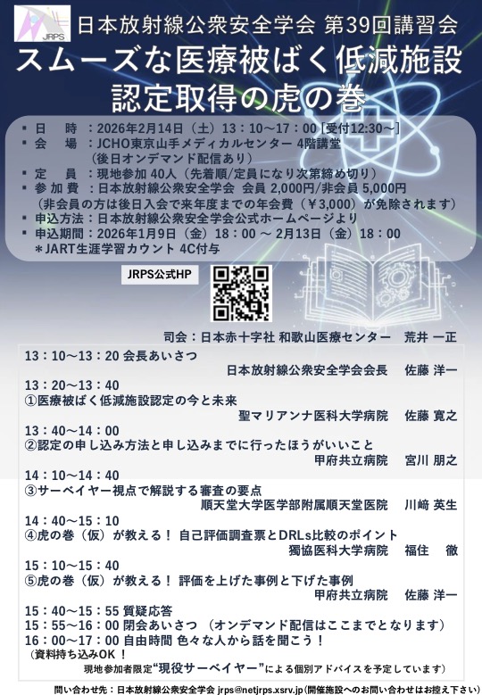 | 費用 | 日本放射線公衆安全学会 会員:2,000円 非会員:5,000円 (非会員の方は後日入会で来年度までの年会費(¥3,000)が免除されます) |