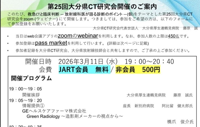 オンライン オンライン開催です 開催情報 主催 GEヘルスケアファーマ株式会社 後援 やまぐち維新CT Conference (山口県CT研究会)一般社団法人山口県診療放射線技師会 開催日 2026年2月14日(土) 開催時間 13:30 ~ 17:00 会場 Web開催(Zoom Webinar) 会場住所 ー 費用 無料 定員 ー 単位付与 日本救急撮影技師認定機構:2単位日本X線CT技師認定 […]