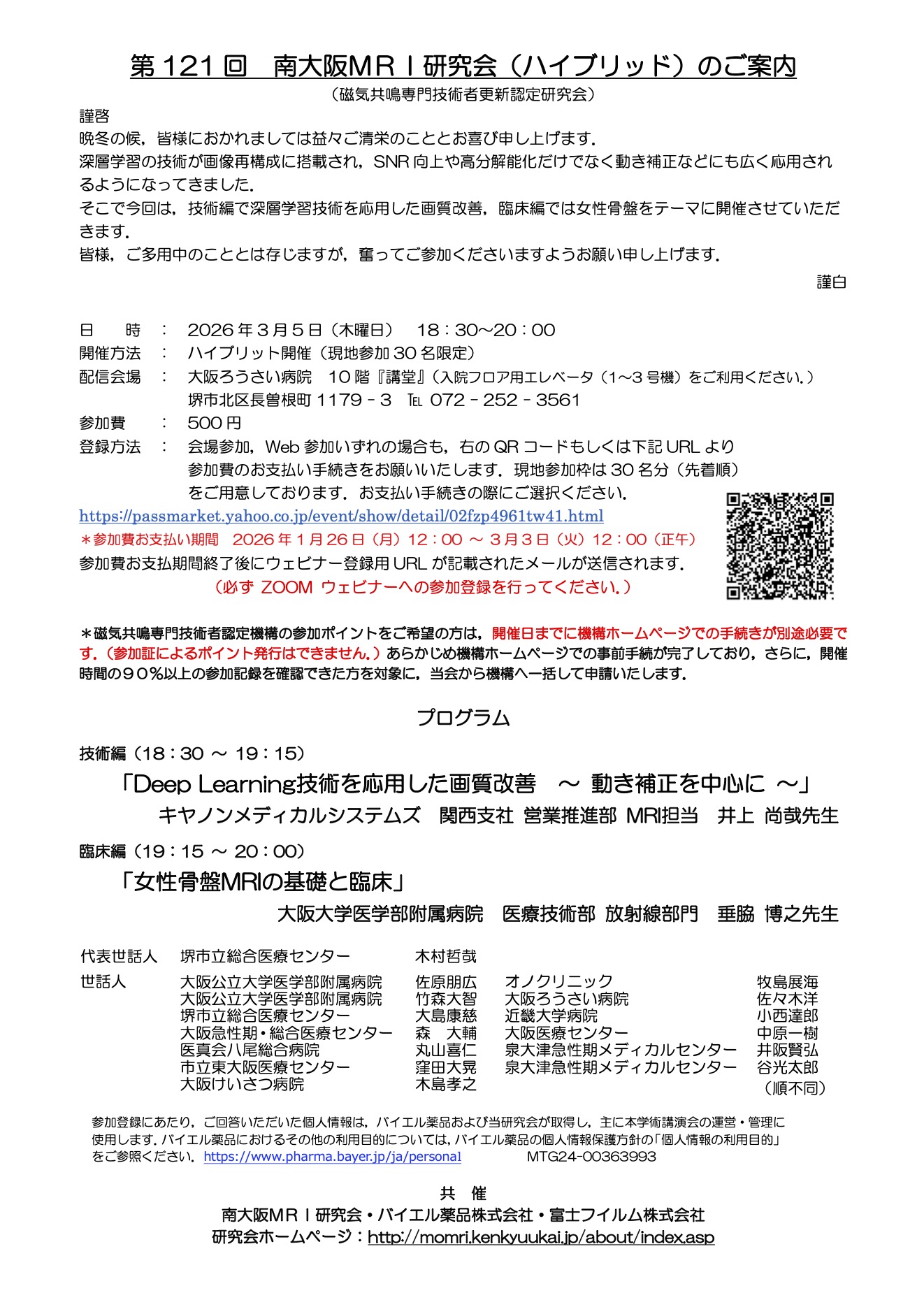 | 共催 | 南大阪MRI研究会 バイエル薬品株式会社 富士フイルム株式会社 |